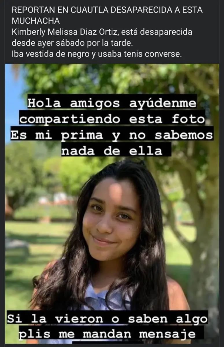 Kimberly Melissa fue vista por última vez el fin de semana, por lo que sus familiares iniciaron su búsqueda a través de redes sociales, pidiendo apoyo para dar con su paradero.