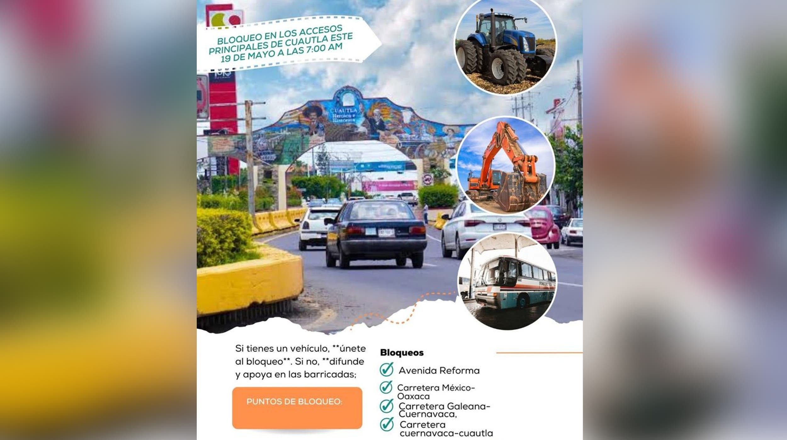 A través de redes sociales comenzó a circular una convocatoria ciudadana para bloquear los principales accesos viales de Cuautla el próximo 19 de mayo a partir de las 7:00 de la mañana. El llamado ha generado preocupación entre la población ante la falta de información oficial y el riesgo de afectaciones a la movilidad regional.