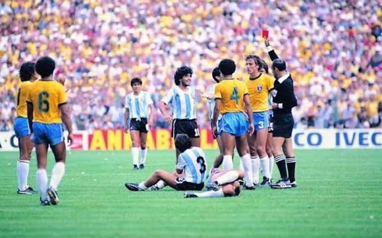 La roja la mostró al “Pelusa” tras cometer una falta sobre el brasileño Joao Batista en el Estadio Sarrià de Barcelona en partido de la segunda ronda.